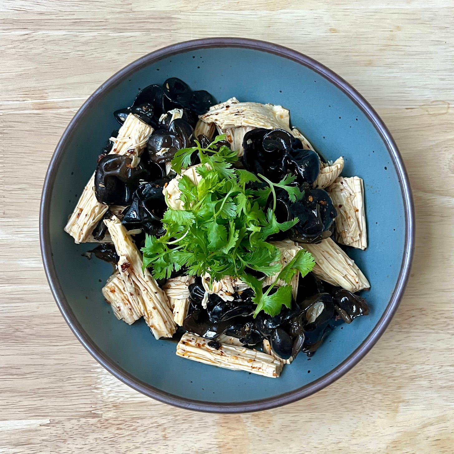 Most everyone who comes over for dinner gets served some version of a tofu skin salad. Dried wood ear mushrooms are particularly compatible with their bouncy texture and similar cooking time. The salad holds up wonderfully dressed hours in advance— you’d never guess it all comes from the back of my pantry.