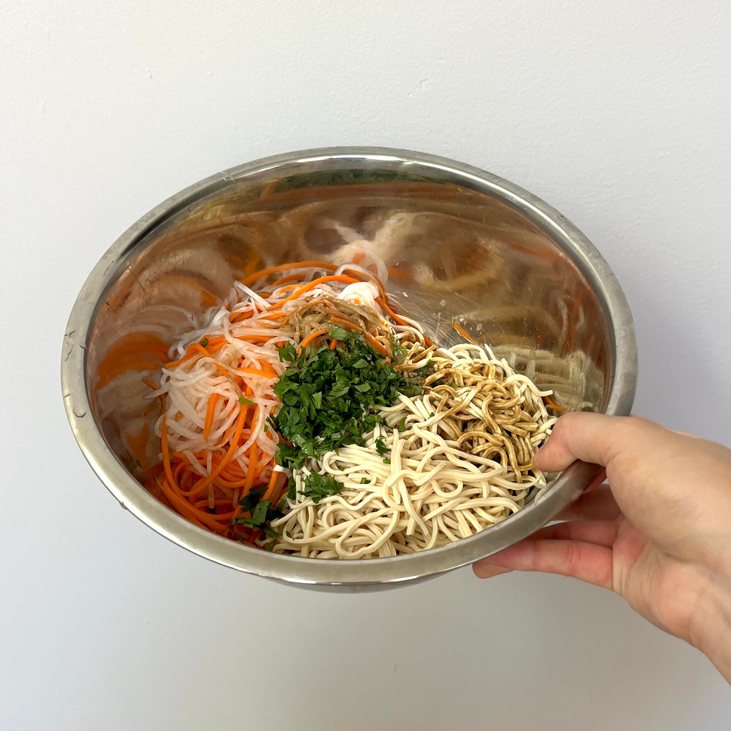 Squeeze any excess water out of the cooled tofu and add it to a large mixing bowl along with the daikon and carrot. Pour the sauce along the edges of the mixing bowl and toss until evenly distributed. Garnish with cilantro and serve. Keeps well in the refrigerator for up to 3 days (for best results, store the sauce separately to keep the vegetables from going soggy).