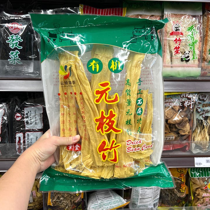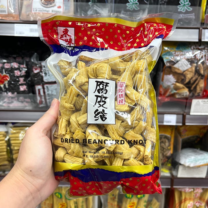 Subsequent skimmed layers are more protein dense and typically dried into fuzhu 腐竹, tofu skin sticks. Fuzhu is chewy and layered, a unique combination that allows it to soak up flavor from sauces without going soggy. In Chinese Buddhist vegetarian cooking fuzhu is a common meat stand-in for braises and stir fries. Dry tofu skin sticks can be found in Chinese grocery stores in the pantry aisles, often labeled as “dried bean curd”. Some even come as precut segments and bite sized pieces tied into knots. Stored dry, they keep for years and can be rehydrated by soaking in room-temperature water for at least an hour.